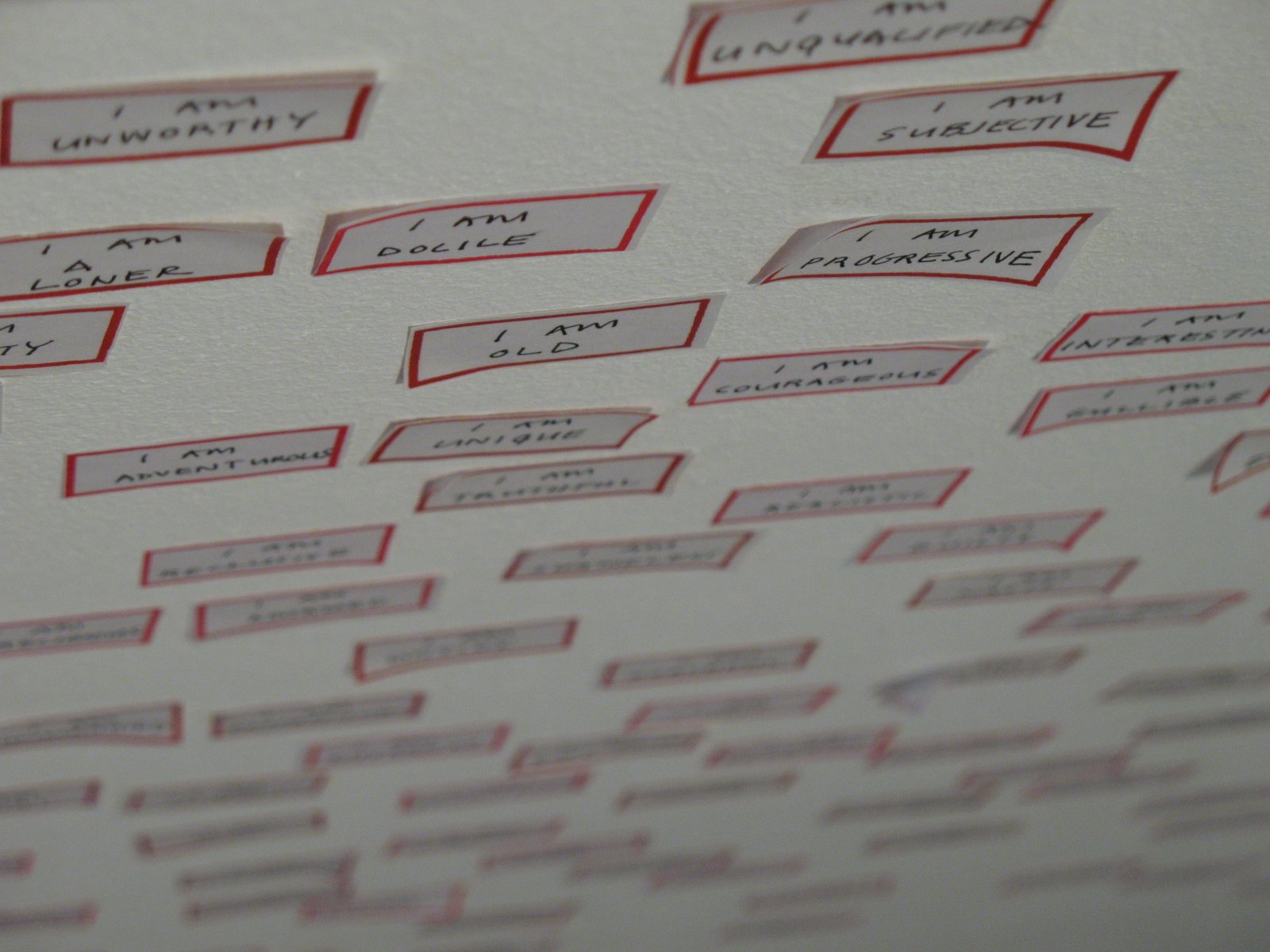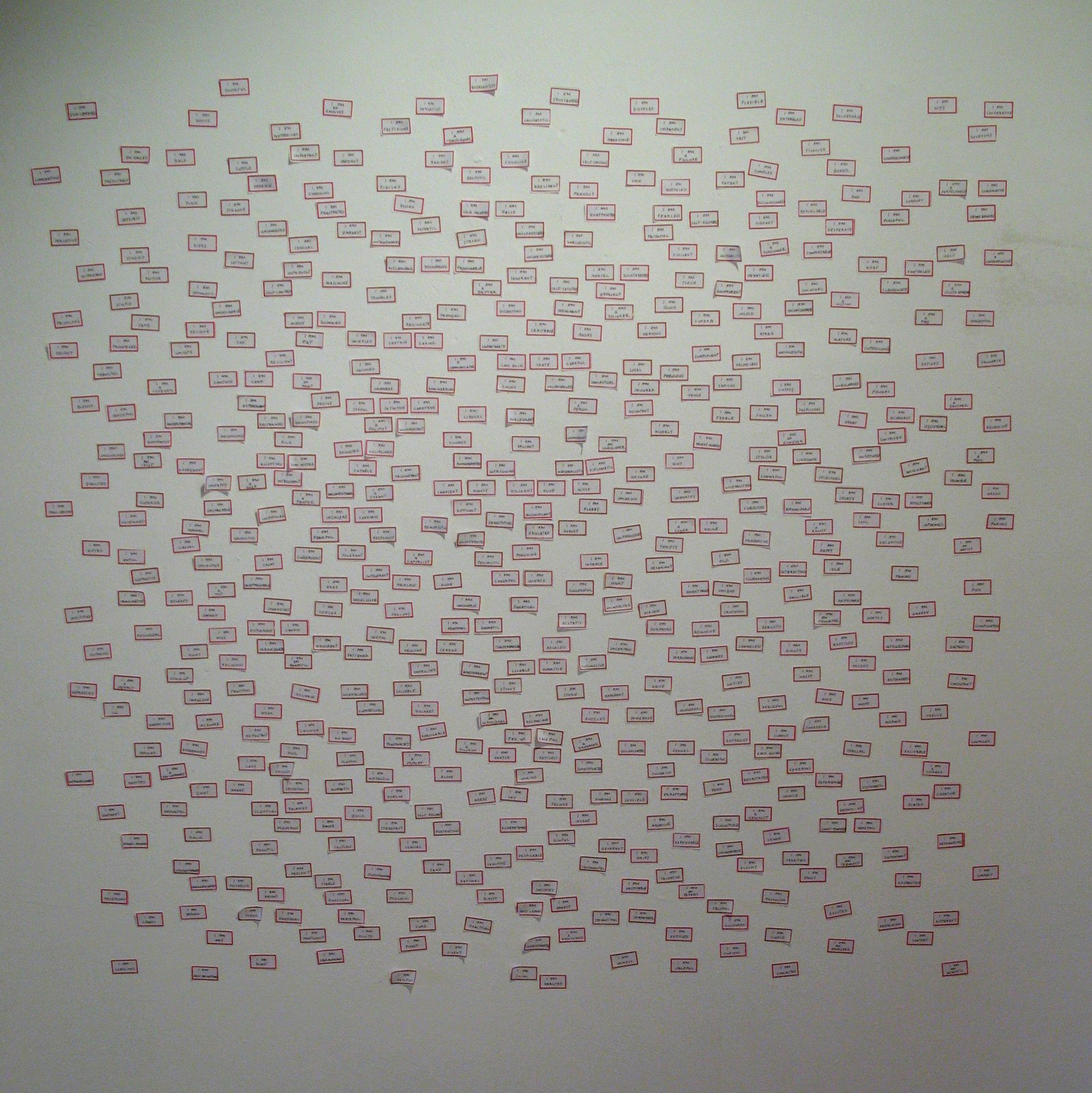 EXCHANGE EXCHANGEInstallation 2010 EXCHANGE Installation 2010 EXCHANGE Installation 2010 EXCHANGE Installation 2010 EXCHANGE Installation 2010 EXCHANGE Installation 2010 EXCHANGE Installation 2010 EXCHANGE Installation 2010 THE SPARK THAT WEAVES THE TISSUEEnamel on Canvas. 30 x 40 cm each. 2010 TO CONSTRUCT A SELFWriting on Labels. 2010 TO CONSTRUCT A SELF (DETAIL). Writing on Labels. 2010